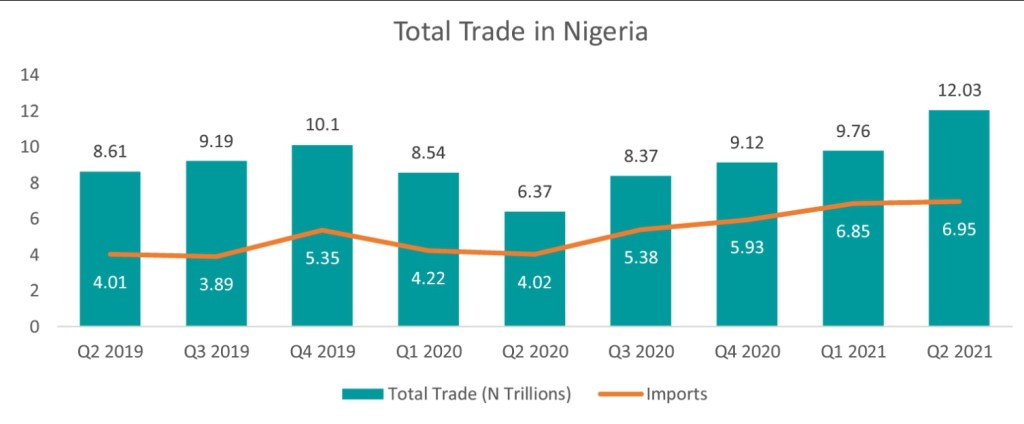 In Nigeria, import restrictions on certain locally produced alternatives have been previously implemented such as the ban of the importation of 41 items by the government in 2015. In some ways, this helped to promote the development and growth of local industry and production. With similar measures, the value of Nigeria’s total trade in Q2 2021 amounted to N12.03 Trillion representing a 23.28% increase compared to Q1 2021 value and 88.71% increase compared to Q2 2020. Imports were valued at N6.95 Trillion or 57.78%, indicating a 1.45% increase in Q2 2021 against the level of imports in Q1 2021 and 67.49% increase compared to Q2 2020. On the other hand, exports were valued at N5.08 Trillion, indicating an increase of 74.72% compared to Q1 2021 and 128.29% compared to Q2 2020.